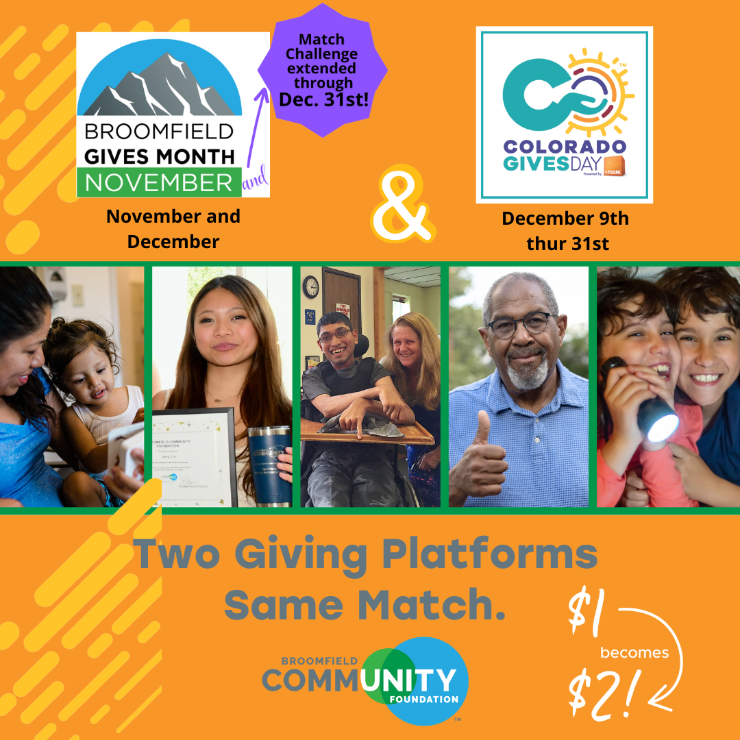 This November, during Broomfield Gives Month, your gift to the Broomfield Community Foundation will be matched $1-for-$1 (up to $60,000)—doubling your impact for neighbors who need it most.