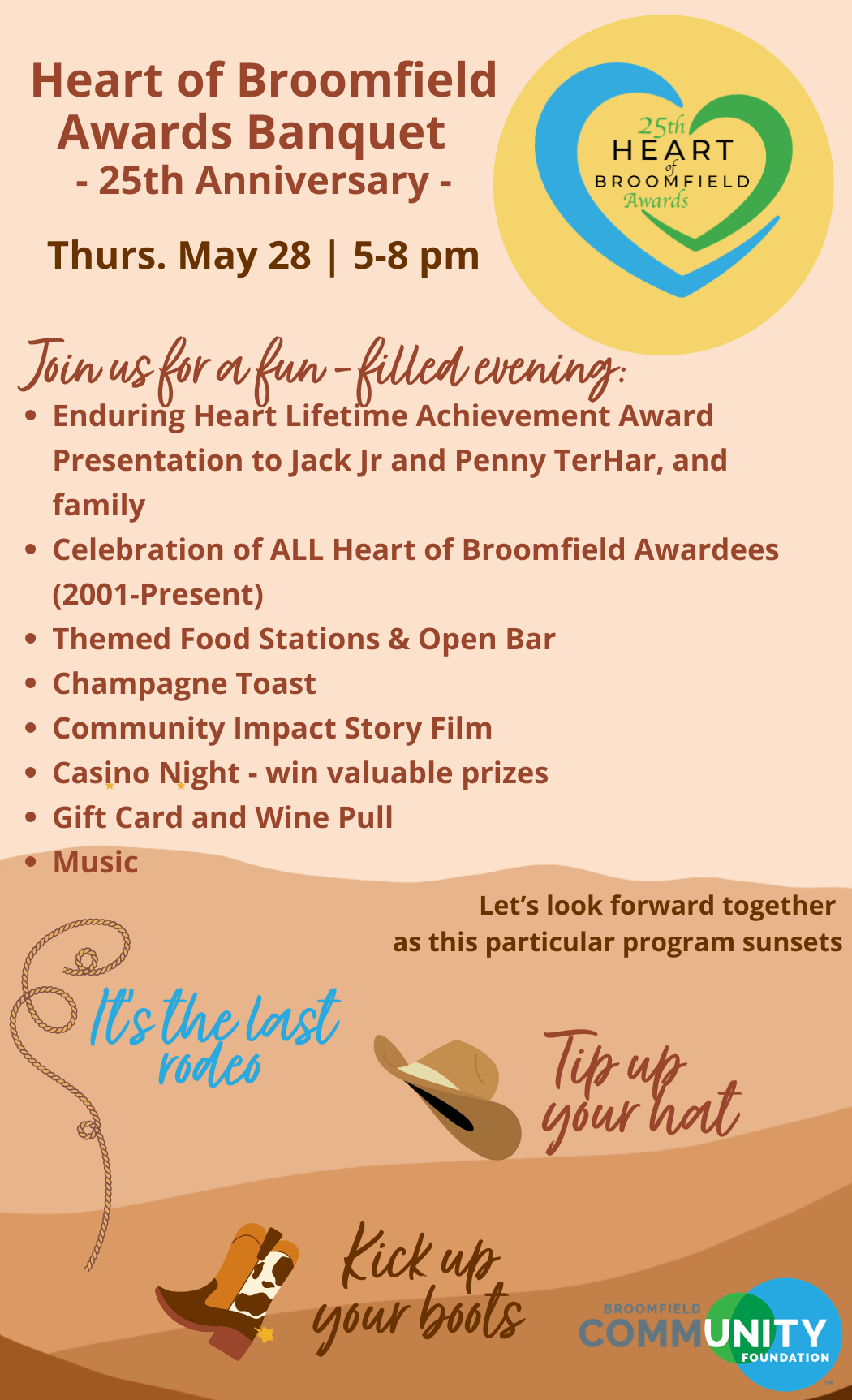 Join us for the 25th and final Heart of Broomfield Awards, a milestone celebration honoring the people and generosity that have shaped our community for a quarter century.