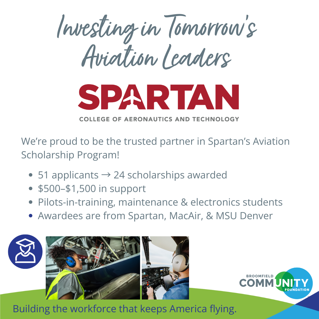 The Broomfield Community Foundation is proud to announce the 2025 Spartan Aviation Scholarship recipients. This year, 51 applicants competed for funding, with 24 winners awarded scholarships ranging from $500 to $1,500.