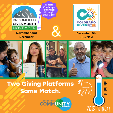 This November, during Broomfield Gives Month, your gift to the Broomfield Community Foundation will be matched $1-for-$1 (up to $60,000)—doubling your impact for neighbors who need it most.