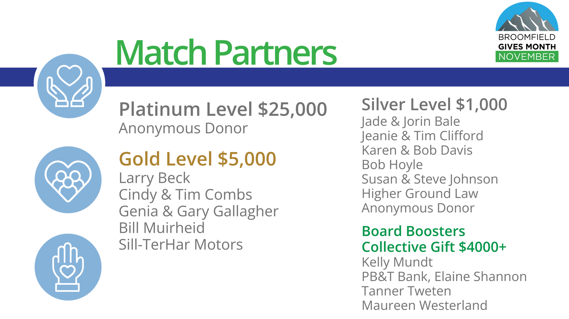 While you might not see it in your everyday life, Broomfield is not immune to today's challenges. Our local food pantries and the city's Meals on Wheels program are working tirelessly to feed many of our neighbors. Local children are in desperate need of medical support and school supplies. Job loss and persistent struggles have created a pressing need for mental health services and income-aligned housing. The list goes on.
